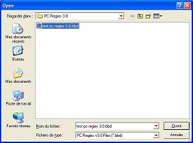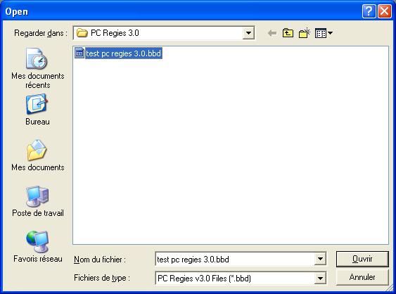 3) Pour ouvrir PC Regies choisissez le dossier C:\PC Regies 3.0 ou C:\PC PPE 1.0 ou C:\PC Salaires 2.0 (en fonction du logiciel que vous avez téléchargé). Puis sélectionnez la base de données à utiliser en cliquant sur son nom, puis sur le bouton Ouvrir